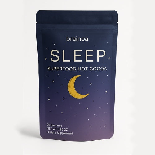 Brainoa blends premium cocoa with adaptogens and minerals shown in 10+ clinical studies to calm a racing mind and support healthy sleep. One delicious cup, one easy ritual, countless softer landings into dreams.